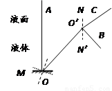 试题分析:将平面镜绕水平轴转过15°角,反射光线将转过30°,反射光线在液面处的入射角等于30°,而反射光在液面处形成的反射光与折射光垂直,画出光路图,根据几何知识求出入射角为i=30°,折射角为r=60°,算出折射率n,结合公式