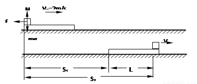 (2)由运动过程示意图可知,木板滑动距离S1,行李包滑动距离S2及木板长度L间的几何关系为 L= S2 -S1 1