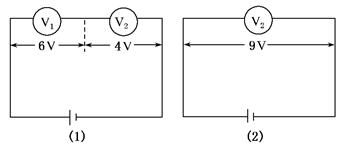 如图(1)所示,电压表V1、V2串联接入电路中时,示数分别为6 V和4 V,当只有电压表V2接入电路中时,如图(2)所示,示数为9 V,电源的电动势为( )
