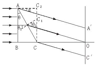 平行光束经棱镜折射后的出射光束仍是平行光束,如下图所示.图中θ1、θ2为AC面上入射角和折射角,根据折射定律,有![]()