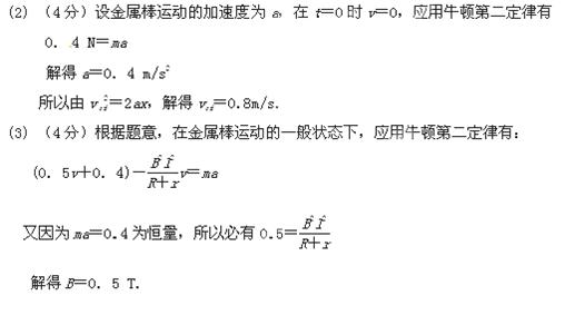 如图所示,光滑的平行金属导轨水平放置,电阻不计,导轨间距为l,左侧接一阻值为R的电阻。区域cdef内存在垂直轨道平面向下的有界匀强磁场,磁场宽度为x。一质量为m,电阻为r的金属棒MN置于导轨上,与导轨垂直且接触良好,受到水平拉力F=(0.5v+0.4) N(v为某时刻金属棒运动的瞬时速度)的作用,从磁场的左边界由静止开始运动,已知l=1m,m=1kg,R=0.3Ω,r=0.2Ω,x=1m,如果测得电阻R两端的电压U随时间均匀增大,那么: