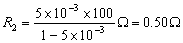 有一个电阻元件R 1 = 100Ω,允许通过的最大电流为5Ma。 在图所示的并联电路中,已知干路中的电流I = 1A,并联电阻R2应为多大?
