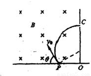 如图所示的区域中,左边为垂直纸厦向里的匀强磁场,磁感应强度为B,右边是一个电场强度大小未知的匀强电场,其方向平行于OC向上且垂直于磁场方向,在P点有一个放射源,在纸平面内向各个方向放射出质量为m、电荷量为-q速度大小相等的带电粒子.有一初速度方向与边界线的夹角θ=60°的粒子(如图所示),恰好从O点正上方的小孔C垂直于OC射入匀强电场,最后打在Q点.已知OC=L,OQ=2L,不计粒子的重力,求:(1)该粒子的初速度v的大小;