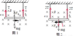 如图所示,长L、质量为m的金属杆ab,被两根竖直的金属丝静止吊起,金属杆ab处在方向垂直纸面向里的匀强磁场中.当金属杆中通有方向a→b的电流I时,每根金属丝的拉力大小为T.当金属杆通有方向b→a的电流I时,每根金属丝的拉力大小为2T.求磁场的磁感应强度B的大小.