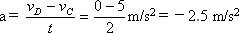 解:如上图所示图示中AB为加速,BC为匀速,CD为减速,匀速运动的速度既为AB段的末速度,也为CD段的初速度,这样一来,就可以利用公式方便地求解了. 由题意画出图示,由运动学公式知:vb=v0+at=5 m/s,vc=vb=5 m/s 由v=v0+at应用于CD段(vD=0)得: 负号表示a与v0方向相反. |