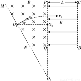如图所示,在MN与PQ之间存在着磁感应强度为B=2×10-3 T的匀强磁场,磁场方向垂直纸面向内.在PQ与CD之间存在着电场强度为E=40V/m的匀强电场,电场方向水平向左,宽度为L=0.2m.一质量为m=6.4×10-27 kg,电荷量为q=-3.2×10-19 C的带电粒子,从O1点以速度v垂直MN射入磁场,方向与水平直线O1 O2的夹角为30°,且O1 O2=0.2m.之后,粒子又垂直PQ进入电场区域,最后在边界CD穿出.求: