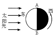 如图所示,太阳光照射到地球上,地球左半球为白天,右半球为黑夜,地球自西向东转 (见箭头指示转动方向),A点表示清晨,B点表示傍晚.在A点向东或向西或在B点向东飞行均不能看到“太阳从西边升起”的奇妙现象,只有在B点向西飞行(即追赶快落山的太阳)能满足题意.