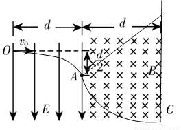 ÈçͼËùʾ£¬ÔÈÇ¿µç³¡ÇøÓòºÍÔÈÇ¿´Å³¡ÇøÓòÊǽôÁÚµÄÇÒ¿í¶ÈÏàµÈ¾ùΪd£¬µç³¡·½ÏòÔÚÖ½Æ½ÃæÄÚÊúÖ±ÏòÏ£¬¶ø´Å³¡·½Ïò´¹Ö±Ö½ÃæÏòÀһ´øÕýµçÁ£×Ó´ÓOµãÒÔËÙ¶Èv0´¹Ö±µç³¡·½Ïò½øÈëµç³¡£¬´ÓAµã³öµç³¡½øÈë´Å³¡À뿪µç³¡Ê±´øµçÁ£×ÓÔڵ糡·½ÏòµÄÆ«×ªÎ»ÒÆÎªµç³¡¿í¶ÈµÄÒ»°ë£¬µ±Á£×ӴӴų¡Óұ߽çÉÏCµã´©³ö´Å³¡Ê±ËÙ¶È·½ÏòÓë½øÈëµç³¡OµãʱµÄËÙ¶È·½ÏòÒ»Ö£¬ÒÑÖªd¡¢v0(´øµçÁ£×ÓÖØÁ¦²»¼Æ)£¬Çó£º