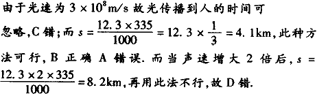 一人看到闪电12.3 s后又听到雷声.已知空气中的声速约为300 m/s~340 m/s,光速为3×108 m/s,于是他用12.3除以3很快估算出闪电发生位置到他的距离为4.1 km.根据你所学的物理知识可以判断
