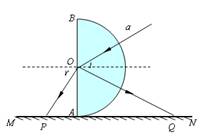 ,直径AB与屏幕垂直并接触于A点.激光a以入射角i=30°射向半圆玻璃砖的圆心O,结果在水平屏幕MN上出现两个光斑.(已知sinC=