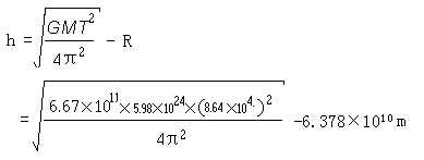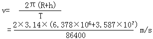 解: 同步卫星的周期与地球自转的周期相同, 即T=86400s. 设同步卫星的高度为h, 地球对卫星的引力作为向心力, 即