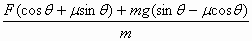 (2)沿杆方向,由牛顿第二定律得: Fcos 垂直于杆方向,由共点力平衡条件得: FN+Fsin 又Ff=μN ⑤ 联立③④⑤式得: a= 将F=0.5 mg代入上式得a= 由运动学公式得:s= 所以t= |