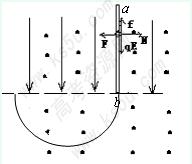 的绝缘细杆,沿电场线放置在虚线上方的场中,b端恰在虚线上,将一套在杆上的带正电的电量为q、质量为m的小球(小球重力忽略不计),从a端由静止释放后,小球先作加速运动,后作匀速运动到达b端,已知小球与绝缘杆间的动摩擦系数μ=0.3,当小球脱离杆进入虚线下方后,运动轨迹是半圆,圆的半径是