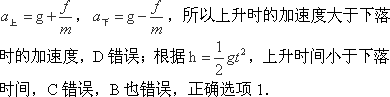 | A、刚抛出时的速度最大 | B、在最高点的加速度为零 | C、上升时间小于下落时间 | D、上升时的加速度大于下落时的加速度 |