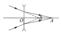 向凹透镜投影一束会聚光线,经透镜折射后,光线会聚在A点,如图所示。假如移去透镜,会聚光线相交于另一点B。设OA=50cm,AB=40cm,则此透镜的焦距为___。![]()