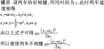 v1匀速行驶,司机发现前方同轨道上相距x0处有另一列火车沿同方向以速度v2(相对地,且v1>v2)做匀速运动,司机立即以大小为a的加速度紧急刹车,要使两车不相撞,a至少为![]()