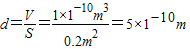点评:本题是以油酸分子呈球型分布在水面上,且一个靠一个,从而可以由体积与面积相除求出油膜的厚度,计算时注意单位的换算.