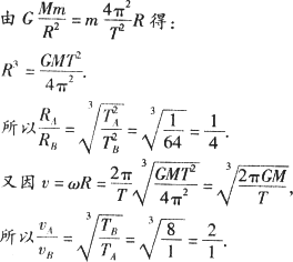 两颗人造卫星A、B绕地球做匀速圆周运动,周期之比TA∶TB=1∶8,则轨道半径之比和运动速度之比分别为
