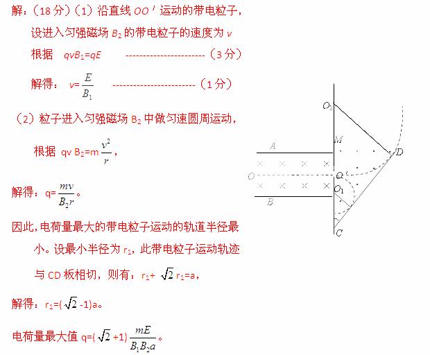 £¨2013ÌÆÉ½Ãþµ×£©ÈçͼËùʾ£¬Á½Æ½ÐнðÊô°åABÖмäÓл¥Ïà´¹Ö±µÄÔÈÇ¿µç³¡ºÍÔÈÇ¿´Å³¡¡£A°å´øÕýµçºÉ£¬B°å´øµÈÁ¿¸ºµçºÉ£¬µç³¡Ç¿¶ÈΪE£»´Å³¡·½Ïò´¹Ö±Ö½ÃæÏòÀ´Å¸ÐӦǿ¶ÈΪB1¡£Æ½ÐнðÊô°åÓÒ²àÓÐÒ»µ²°åM£¬ÖмäÓÐС¿×O¡ä£¬OO¡äÊÇÆ½ÐÐÓÚÁ½½ðÊô°åµÄÖÐÐÄÏß¡£µ²°åÓÒ²àÓд¹Ö±Ö½ÃæÏòÍâµÄÔÈÇ¿´Å³¡£¬´Å³¡Ó¦Ç¿¶ÈΪB2¡£CDΪ´Å³¡B2±ß½çÉϵÄÒ»¾øÔµ°å£¬ËüÓëM°åµÄ¼Ð½Ç¦È=45¡ã£¬O¡äC=a£¬ÏÖÓдóÁ¿ÖÊÁ¿¾ùΪm£¬º¬Óи÷ÖÖ²»Í¬µçºÉÁ¿¡¢²»Í¬ËٶȵĴøµçÁ£×Ó£¨²»¼ÆÖØÁ¦£©£¬×ÔOµãÑØOO¡ä·½Ïò½øÈëµç´Å³¡ÇøÓò£¬ÆäÖÐÓÐЩÁ£×ÓÑØÖ±ÏßOO¡ä·½ÏòÔ˶¯£¬²¢½øÈëÔÈÇ¿´Å³¡B2ÖУ¬Çó£º