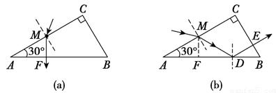 思路分析:根据折射定律先算出出射点在AB边上离A点的位置,再根据几何知识折射定律算出出射点在BC边上离B的位置。