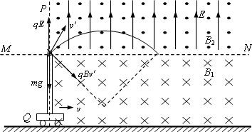 (2)在小球运动到管口时,FN=2.4×10-3 N,设v1为小球竖直分速度,由 由 (3)小球离开管口进入复合场,其中qE=2×10-3 N,mg=2×10-3 N.(1分) 故电场力与重力平衡,小球在复合场中做匀速圆周运动,合速度 小球离开管口开始计时,到再次经过MN所通过的水平距离 对应时间 小车运动距离为x2, |