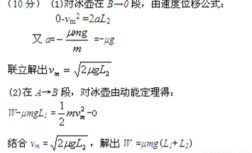 2010年2月在加拿大温哥华举行的第2l届冬季奥运会上,冰壶运动再次成为人们关注的热点,中国队也取得了较好的成绩。如图所示,假设质量为m的冰壶在运动员的操控下,先从起滑架A点由静止开始加速启动,经过投掷线B时释放,以后匀减速自由滑行刚好能滑至营垒中心O停下。已知AB相距L1,BO相距L2,冰壶与冰面各处动摩擦因数均为μ,重力加速度为g。求: