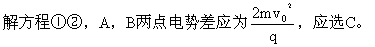 如图所示,质量为m,带电量为q的粒子,以初速度v0,从A点竖直向上射入真空中的沿水平方向的匀强电场中,粒子通过电场中B点时,速率vB=2v0,方向与电场的方向一致,则A,B两点的电势差为:
