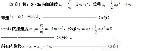 某1kg物体在水平拉力F作用下,由静止开始在光滑水平面上做直线运动,力F随时间t变化的规律如图所示,则物体在前4s内的位移为多少?