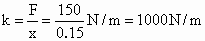在 150N的压力作用下缩短了15cm.由胡克定律F=kx得,