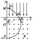 (12分)在平面直角坐标系xOy中,第Ⅰ象限存在沿y轴负方向的匀强电场,第Ⅳ象限存在垂直于坐标平面向外的匀强磁场,磁感应强度为B.一质量为m、电荷量为q的带正电的粒子从y轴正半轴上的M点以速度v0垂直于y轴射入电场,经x轴上的N点与x轴正方向成θ=60°角射入磁场,最后从y轴负半轴上的P点垂直于y轴射出磁场,如图所示.不计粒子重力,![]()