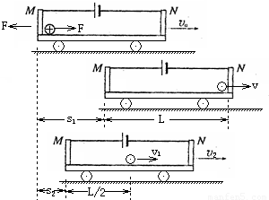 如图所示,在光滑水平地面上有一小车,车底板光滑且绝缘,车上左右两边分别竖直固定有金属板M、N,两板间的距离为L.M板接电源的正极,N板接电源的负极,两极板间的电场可视为匀强电场.一可视为质点的带正电小球,处在小车底板上靠近M板的位置并被锁定(球与M板不接触),小球与小车以速度v共同向右运动.已知小球带电量为q,质量为m,车、金属板和电源的总质量为3m.某时刻突然解除对小球的锁定,小球在电场力的作用下相对小车向右运动,当小球刚要与小车的N板接触时,小车的速度恰好为零.求:(1)两极板间匀强电场的场强E的大小.