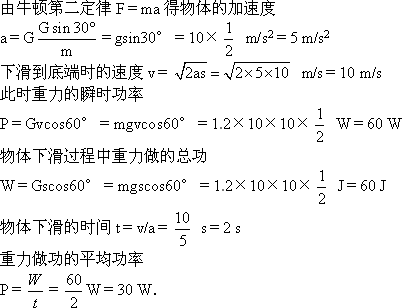 如图所示,倾角为30°、长度为10 m的光滑斜面,一质量为1.2 kg的物体从斜面顶端由静止开始下滑,求物体滑到斜面底端时重力做功的瞬时功率是多少?整个过程中重力做功的平均功率是多少?(g取10 m/s2)