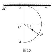 ,直径AB与屏幕MN垂直并接触于A点。激光a以入射角i=30°射入玻璃砖的圆心O,在屏幕MN上出现了两个光斑。求这两个光斑之间的距离L。![]()