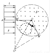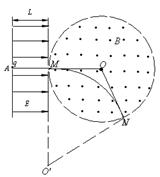ÈçͼËùʾ£¬¿Õ¼ä·Ö²¼×Å·½ÏòƽÐÐÓÚÖ½ÃæÇÒÓë³¡Çø±ß½ç´¹Ö±µÄÓнçÔÈÇ¿µç³¡£¬µç³¡Ç¿¶ÈΪE¡¢¿í¶ÈΪL¡£ÔÚ½ô¿¿µç³¡ÓÒ²àµÄÔ²ÐÎÇøÓòÄÚ£¬·Ö²¼×Å´¹Ö±ÓÚÖ½ÃæÏòÍâµÄÔÈÇ¿´Å³¡£¬Ô²Ðδų¡ÇøÓò°ë¾¶Îªr¡£µ±Ò»´øÕýµçµÄÁ£×Ó£¨ÖÊÁ¿Îªm£¬µçºÉÁ¿Îªq£©´ÓAµã¾²Ö¹Êͷźó£¬ÔÚMµãÀ뿪µç³¡£¬²¢Ñذ뾶·½ÏòÉäÈë´Å³¡ÇøÓò£¬´Å¸ÐӦǿ¶ÈΪB£¬Á£×ÓÇ¡ºÃ´ÓNµãÉä³ö£¬OΪԲÐÄ£¬¡ÏMON£½120¡ã£¬Á£×ÓÖØÁ¦ºöÂÔ²»¼Æ¡£Çó£º