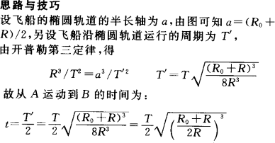 如图所示,飞船沿半径为R的圆周围绕着地球运动,其运行周期为T,如果飞船沿着圆轨道运行,直至将要返回地面,可在轨道的某一点A处将速率降低到适当的数值,从而使飞船沿着以地心O为焦点的椭圆轨道到达与地球表面相切的B点,求飞船由A点到B点的时间(图中R0是地球的半径).