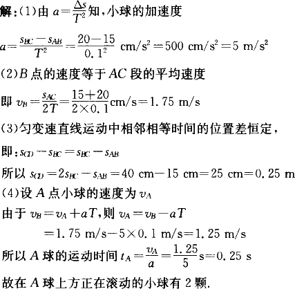 从斜面上某一位置,每隔0.1 s释放一颗小球,在连续释放几颗后,对在斜面上滑动的小球拍下照片,如图所示,测得sAB=1 5 cm,sBC=20 cm,试求: