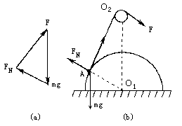 【解答】对小球受力分析如图(a)、(b),因缓慢运动,所以小球受合力为0,则由mg、F、FN构成一个闭合的力的矢量三角形.从图中几何关系可知,力的矢量三角形与△AO1O2相似,所以
