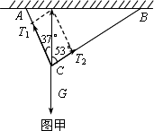 由图可知,物体平衡时AC上的张力T1和BC上的张力T2的 关系:T2=T1tan37° ① 所以当AC上的张力为最大值120 N时,BC上的张力小于120 N, 因此计算中取T1=120 N ② 故重物的最大重力为 (2)在图甲中,设AB=s,由几何关系,绳长l=scos53°+scos37°=1.4 s 若将挂钩换成滑轮,则静止时C点位于AB的中垂线上, 此时两根绳子的张力大小相相等 对C点受力分析,如图乙所示,