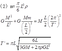 (2)若实验上观测到的运动周期为T’,为了解释两者的不同,目前有一种流行的理论认为,在宇宙中可能存在一种望远镜观测不到的暗物质。作为一种简化模型,我们我们假定在以两个星体连线为直径的球体内均匀分布着密度为ρ的暗物质,而不考虑其它暗物质的影响,并假设暗物质与星体间的相互作用同样遵守万有引力定律。试根据这一模型计算双星系统的运动周期T’。