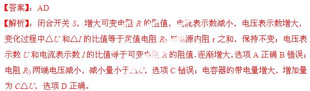 (2013江苏苏南四校联考)如图电路中,电源电动势为E、内阻为r,R0为定值电阻,电容器的电容为C.闭合开关S,增大可变电阻R的阻值,电压表示数的变化量为△U,电流表示数的变化量为△I,则: