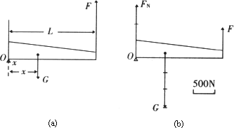 如图(a)所示,设树干长为L,重心至触地点的距离为x,以触地点为支点,由杠杆平衡知识可得FL=Gx,则 由于F和G均为竖直方向的力,树干对地面无相对滑动或相对滑动的趋势,因此在树干触地点仅受地面竖直向上的弹力FN=G-F=(1500-500) N=1000 N,而无摩擦力作用,选定标度后,可画出树干受力的图示如图(b)所示. |