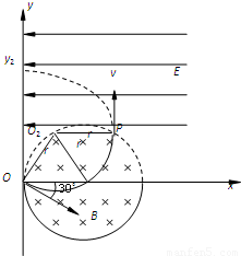 (2)沿x轴正方向射入磁场的质子,在磁场中转过 120°角后,从 P 点再匀速运动一段距离后垂直电场线进入电场.质子进入电场做类平抛运动,根据水平方向偏转距离等于圆周运动的半径,画出轨迹,由几何知识求出质子出磁场时的位置到y轴的距离,由牛顿第二定律和运动学结合求解M点的坐标.