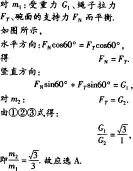 如图所示,一个半球形的碗放在桌面上,碗口水平,O点为其球心,碗的内表面及碗口是光滑的.一根细线跨在碗口上,线的两端分别系有质量为m1和m2的小球,当它们处于平衡状态时,质量为m1的小球与O点的连线与水平线的夹角为α=60°.两小球的质量比