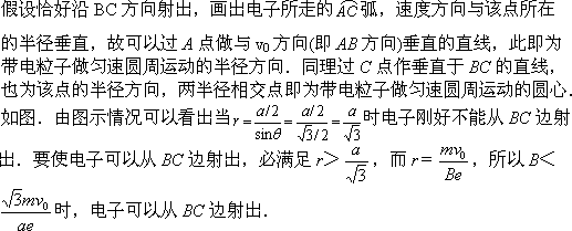 如图所示,荷质比为e/m的电子,以速度v0沿AB边射入边长为a的等边三角形的匀强磁场区域中,欲使电子从BC边穿出,磁感应强度B的取值为
