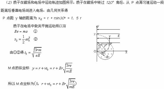 如图所示,真空中有以(r,0)为圆心,半径为 r 的圆形匀强磁场区域,磁场的磁感应强度大小为 B ,方向垂直于纸面向里,在 y = r 的虚线上方足够大的范围内,有水平向左的匀强电场,电场强度的大小为 E ,现在有一质子从 O 点沿与 x 轴正方向斜向下成 30o 方向(如图中所示)射入磁场,经过一段时间后由M点(图中没有标出)穿过y轴。已知质子在磁场中做匀速圆周运动的半径为 r ,质子的电荷量为 e ,质量为 m ,不计重力 、阻力。