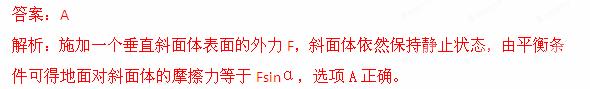 (2013安徽省黄山市联考)一个倾角为α质量为M的斜面体置于粗糙水平地面上,斜面体与粗糙水平地面间动摩擦因数为μ。现施加一个垂直斜面体表面的外力F,斜面体依然保持静止状态,如图所示。地面对斜面体的摩擦力等于