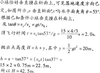 如图所示,小球从倾角为37°的斜面底端的正上方以15 m/s的速度水平抛出,飞行一段时间后恰好垂直撞在斜面上,则小球空中飞行的时间为________s;抛出点距斜面底端的高度为________m.(g取10 m/s2)