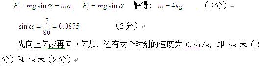 固定光滑细杆与地面成一定倾角,在杆上套有一个光滑小环,小环在沿杆方向的推力F作用下向上运动,推力F与小环速度v随时间变化规律如图所示(4s后小环速度随时间变化未画出)。求![]()