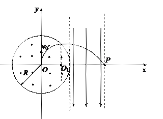 之间有向y轴负方向的匀强电场,在原点O有一离子源向y轴正方向发射速率为v0的带电离子,离子射出磁场时速度与x轴平行,射出磁场一段时间后进入电场,最终从x轴上的P(R+L,0)点射出电场,不计离子重力,求电场强度E与磁感应强度B的比值。