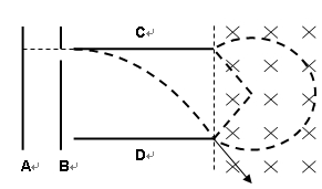 由此可知带电粒子从CD导体板的右下角射出再进入匀强磁场中,欲使粒子不再返回CD板间,带电粒子做圆周运动至CD板右上角时为临界状态,设圆周运动的半径为R,磁感应强度为B。